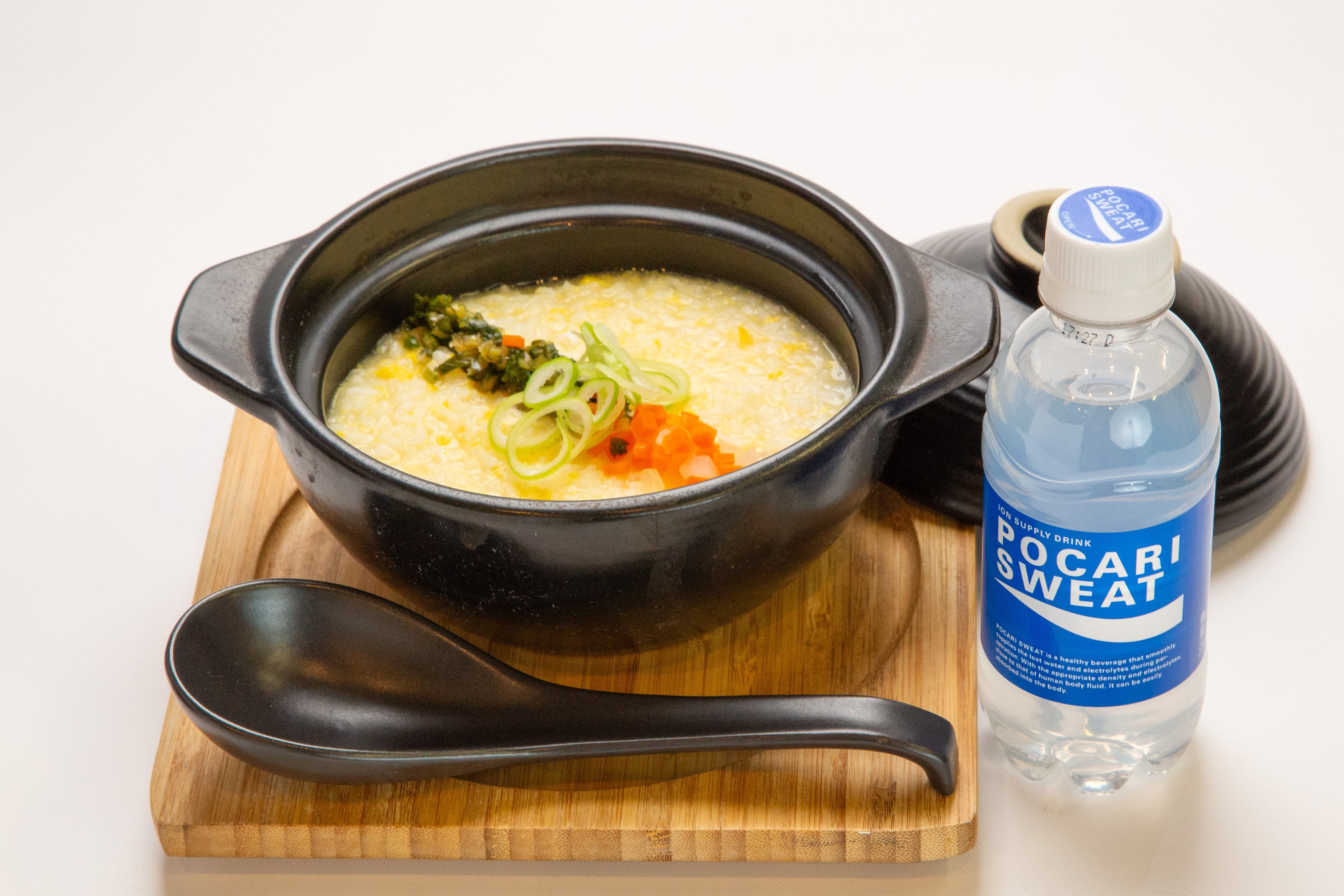 星宮の卵かゆを阿智村の食材を使ってアレンジ再現。温泉にぴったりポカリスエットと一緒に。