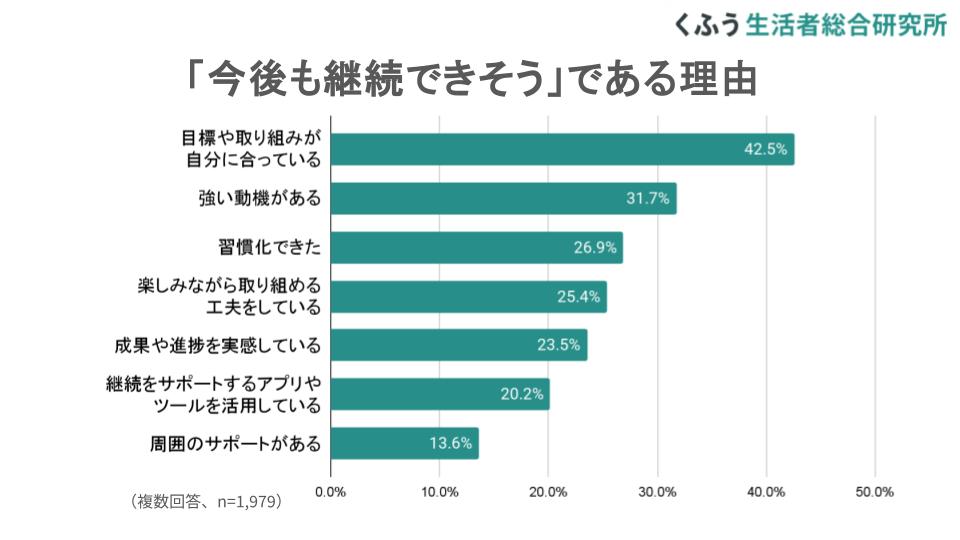 目標達成に向けての取り組みを「継続していて、今後も続けられそう」と回答した人にその理由を聞いたところ、「目標や取り組みが自分に合っている」(42.5%)が最も多い結果となりました。目標自体に「強い動機がある」(31.7%)ことも重要となりそうです。