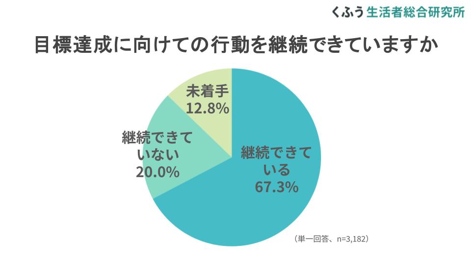 約7割が目標達成に向けての行動を「継続できている」と回答、これから頑張る人も約3割