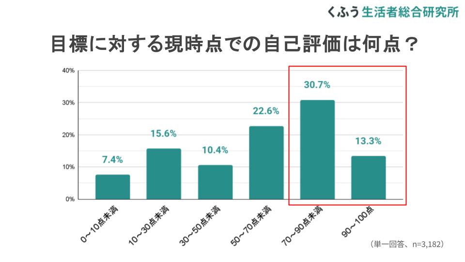 そんな現時点での目標に対する取り組みを100点満点で自己評価してもらったところ、70点以上を付けた人は44.0%となりました。