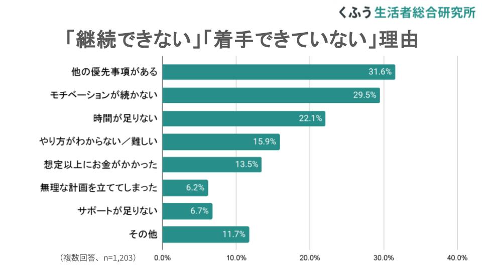 一方、取り組めない理由としては「他の優先事項がある」(31.6%)、「時間が足りない」(22.1%)と時間がないという理由が多く挙がりました。「モチベーションが続かない」(29.5%)、「やり方がわからない/難しい」(15.9%)など心理的なハードルが高いことも、取りかかれない・続けられない要因となっているようです。