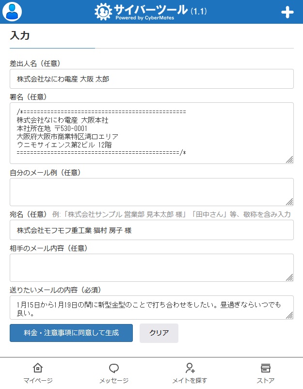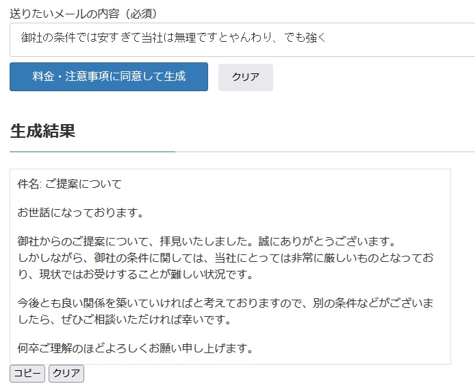 「送りたい内容」を入力すると、AIが最適なメール文面を提案。
