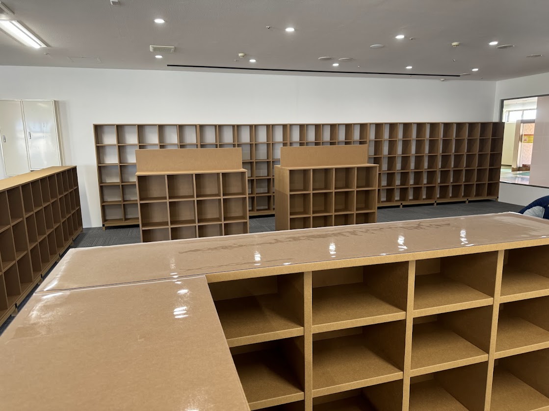 受付カウンターやレンタルボックスなども、強化ダンボールで作製されています。