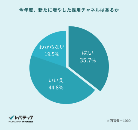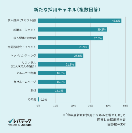 今年度、新たに採用チャネルを増やした企業は35.7%でした。中でも顕著なのは「スカウト型の求人媒体(47.6%)」の増加です。従来の求人掲載に加え、企業側から積極的にアプローチする"攻めの採用"に力を入れる企業が増加しているといえるでしょう。
