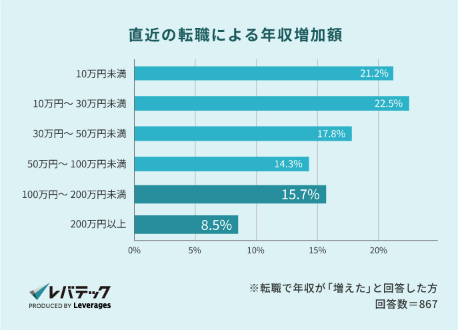 年収の増加幅は「10万以上30万未満(22.5%)」が最も多い一方、100万円以上上がったと回答する人も24.2%存在し、転職によって大幅な年収アップを実現しているケースも見受けられます。