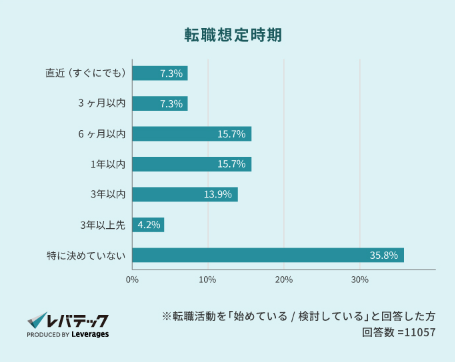 さらに、転職活動中または検討中の人に転職想定時期を質問した結果、「特に決めていない(35.8%)」が最も多く、ついで「6ヶ月以内(15.7% )」「1年以内(15.7% )」という結果になりました。
