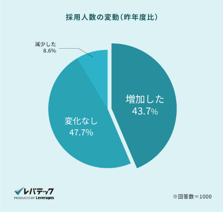 今年度の採用人数について、約4割の企業が昨年度と比較して「増加した」と回答しました。昨年度の調査*1でも同様の結果となっており、採用人数の増加が続いています。