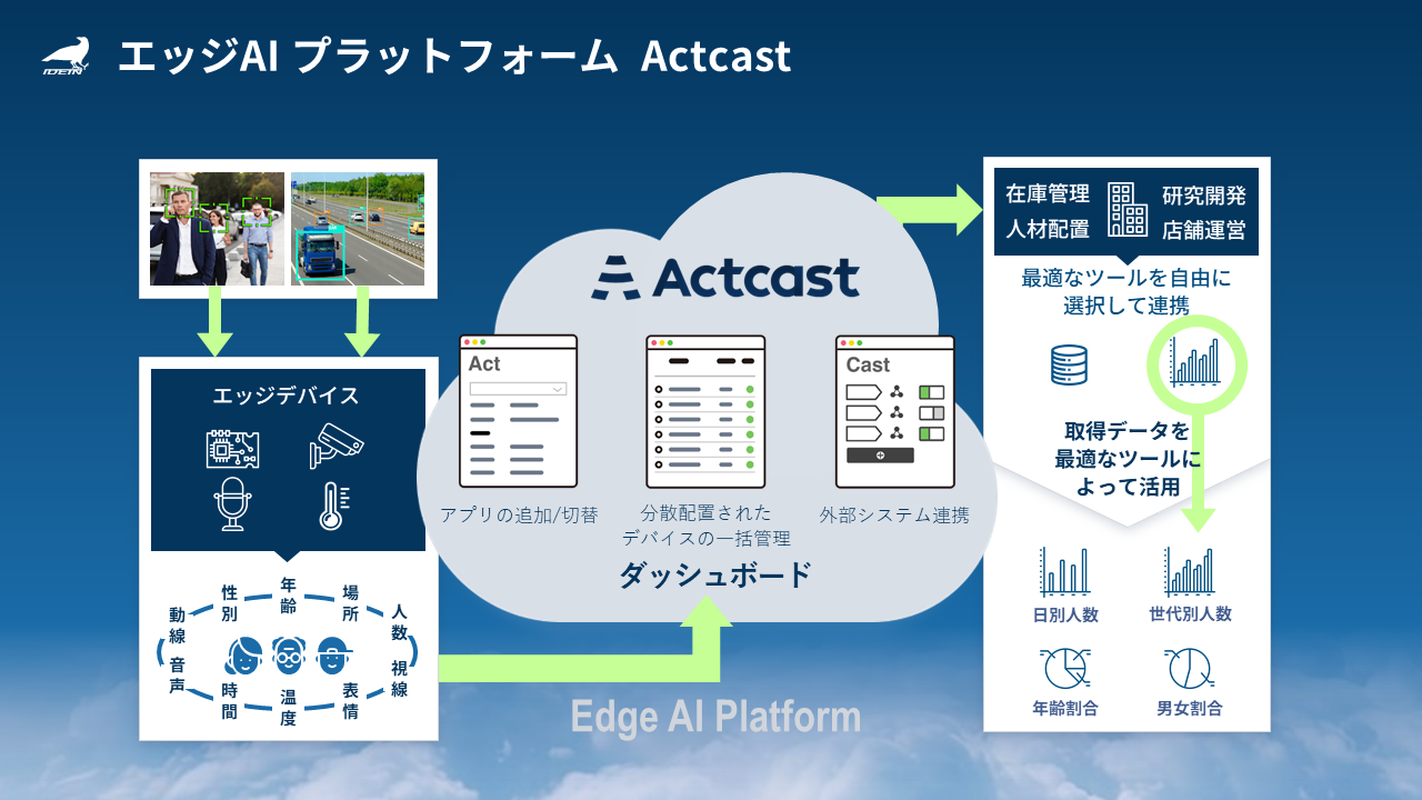 Ideinが技術協力をし、株式会社アイシンが開発・製造するエッジAIカメラです。AIアクセラレータ―チップ「Hailo-8」を搭載したことで、1台8万円という低価格ながら高性能なAIが実行可能です。小売業や製造業等での活用をはじめ、セキュリティや防犯用途などのインフラカメラとして、例えば「スマートシティ」における街や自動運転車両の見守り用途としての活用も想定しています。エッジAIプラットフォーム「Actcast」と連携済みのため、Actcast上で提供されている様々なAIアプリをカメラにインストールするだけで現場にエッジAIを迅速に導入できます。