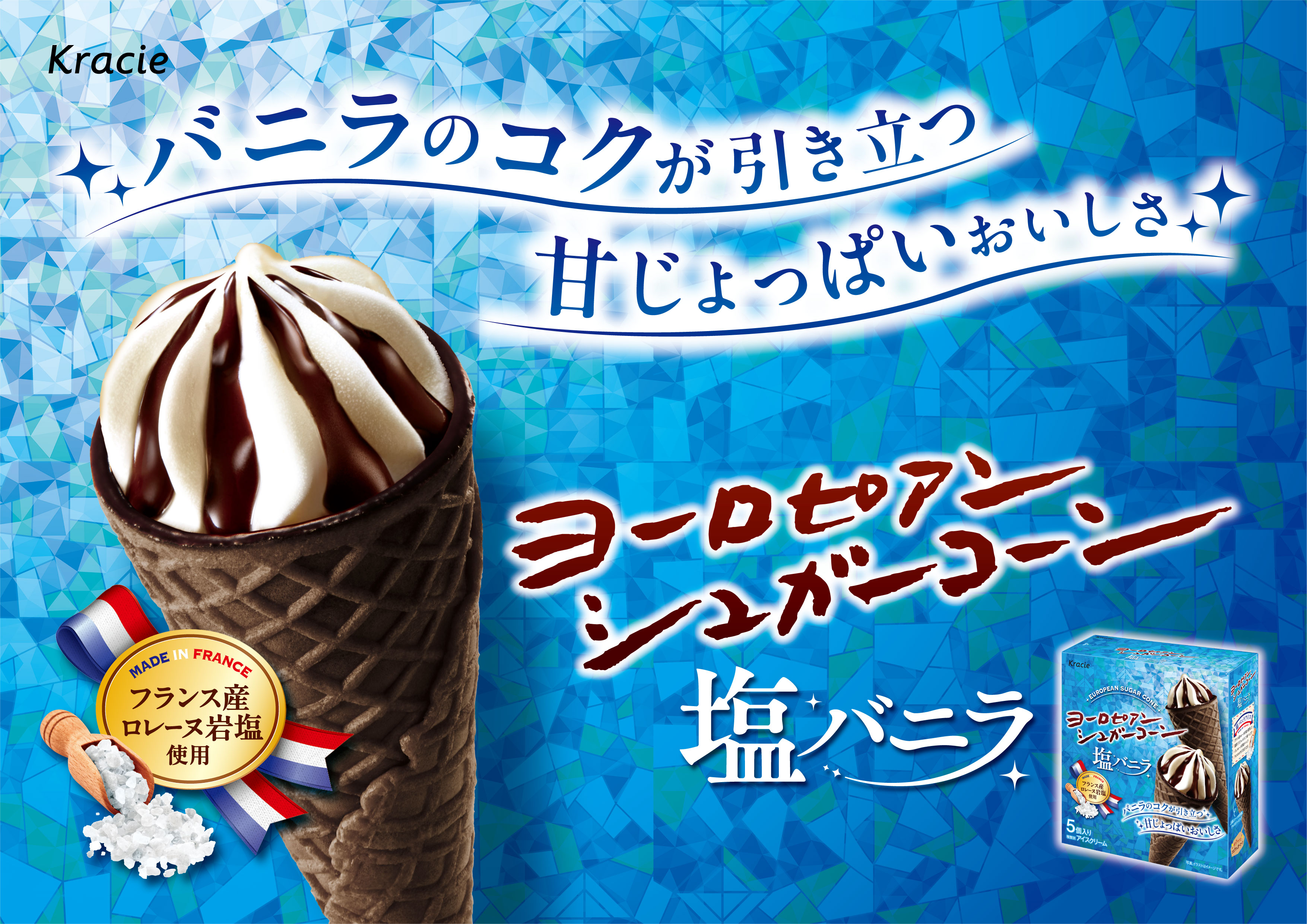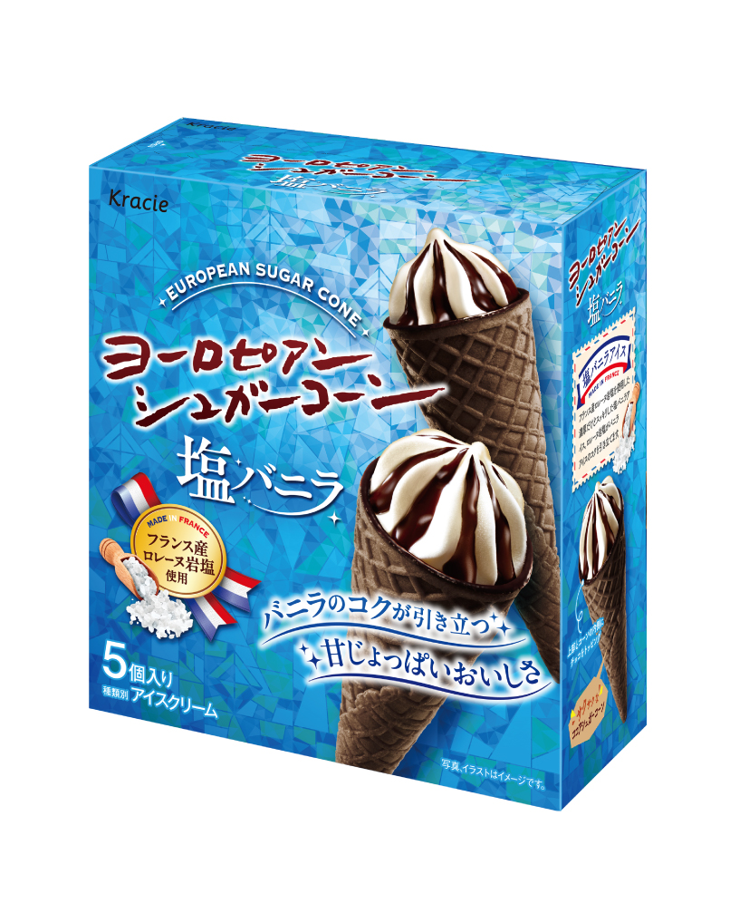 【商品概要】「ヨーロピアンシュガーコーン 塩バニラ」は、コクがありながらスッキリした塩バニラアイスをサクサクのシュガーコーンと合わせました。フランス産ロレーヌ岩塩を使用することでバニラのコクを引き立て、塩とバニラの甘じょっぱさがクセになる美味しさです。近年続く暑い夏にもピッタリの品質です。「塩バニラ」は過去発売したヨーロピアンシュガーコーンの中でも人気のある味で、満を持しての再登場です!