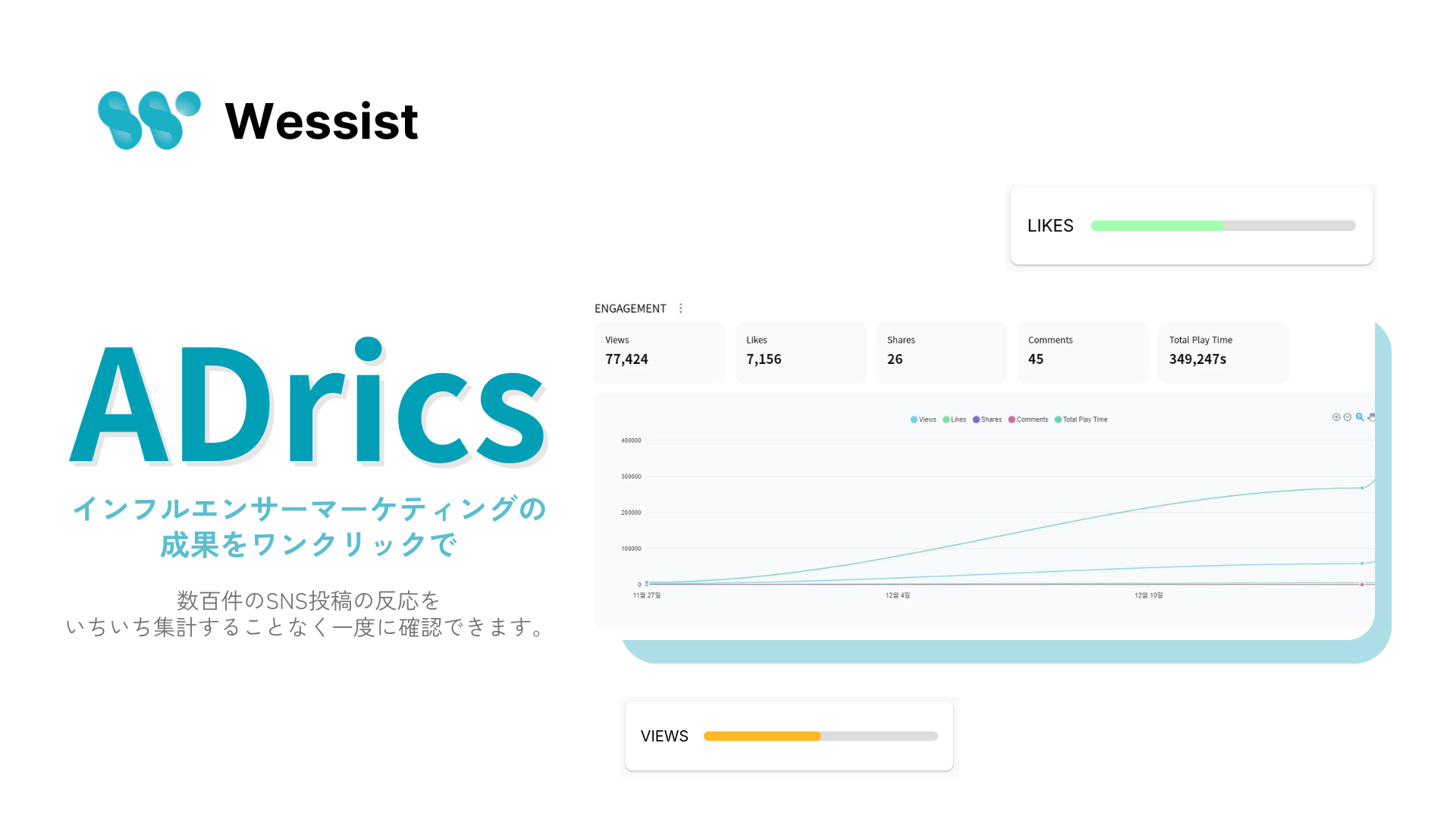 本提携を通じて、aixはWessistの提供する『ADrics』の特徴である、自動化されたSNS広告反応の収集と統合分析機能を活用し、日本および韓国市場でのインフルエンサーマーケティングをさらに強化します。『ADrics』はTikTok、Instagram、YouTubeに対応し、数百件に及ぶSNS投稿のリンクを一括登録するだけで、反応データを自動で収集、統合して分析できます。これにより、広告主やマーケターは、煩雑なデータ収集作業を削減し、広告キャンペーンの成果確認と改善に注力できるようになります。