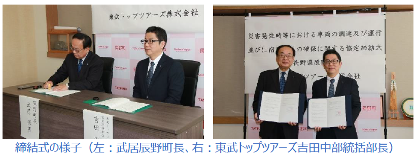 東武トップツアーズ株式会社(本社:東京都墨田区、代表取締役社長:百木田康二)は、2025 年1月28 日に、長野県辰野町(町長:武居保男)と「災害発生時等における車両の調達及び運行並びに宿泊施設の確保に関する協定」を締結しましたのでお知らせいたします。