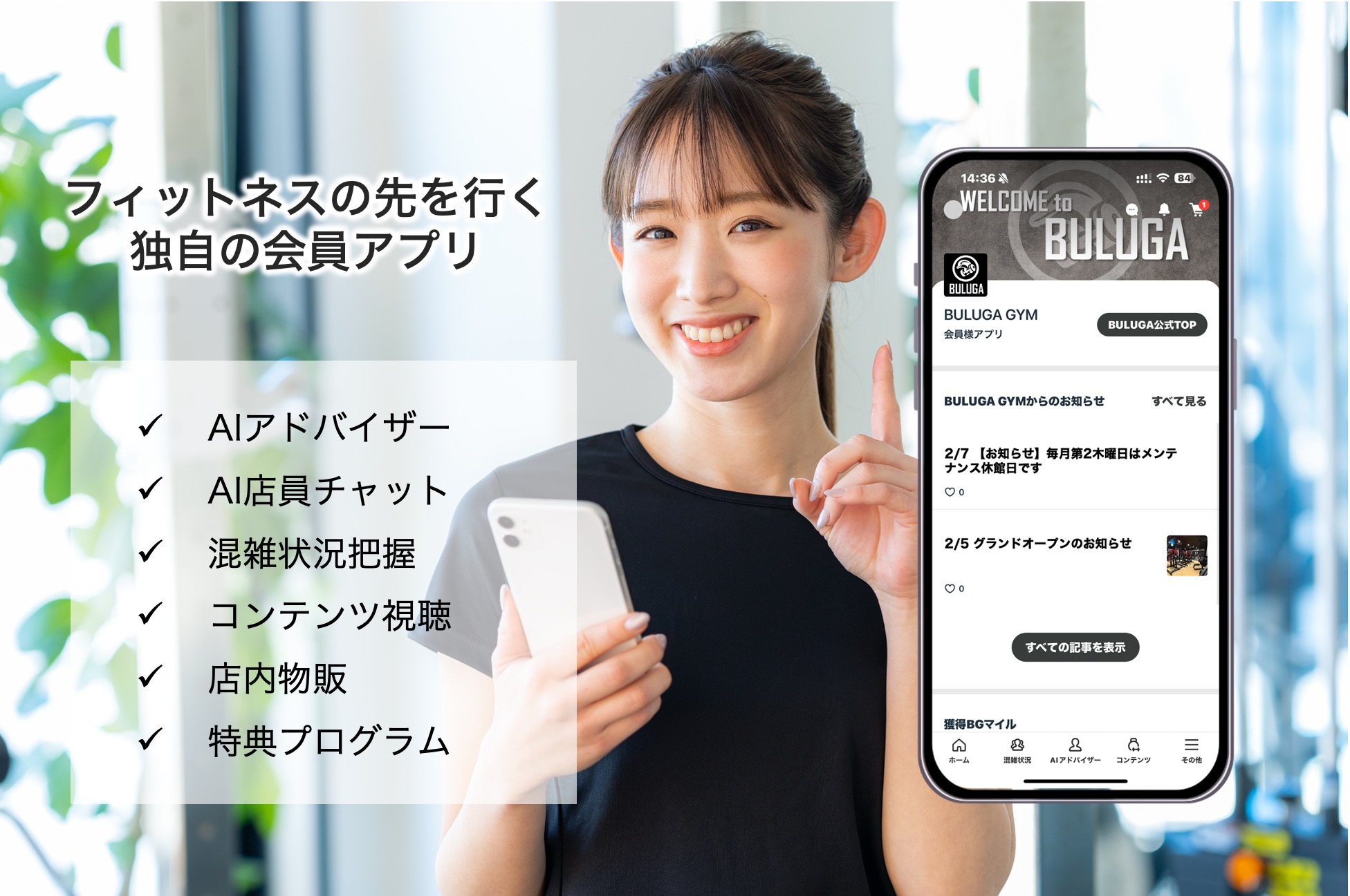 「BULUGA GYMアプリ」は、他にはない「店頭スタッフチーム」が「システム設計・開発・運用」をすべて手掛ける垂直統合モデルのデジタルソリューションです。エリア初の「ダブルAI+人の目」によるサポート体制を導入し、ジム利用者に安心感と利便性を提供。さらに、バルーガジム専用に最適化された設備連動型AIを活用し、利用者一人ひとりに効果的なトレーニング体験を届けます。