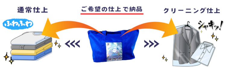 仕上げは「お洗濯物」は通常仕上げで、クリーニング品はクリーニング仕上げの後、ハンガー吊りではない形(ふんわりたたむ)で納品させていただきます。