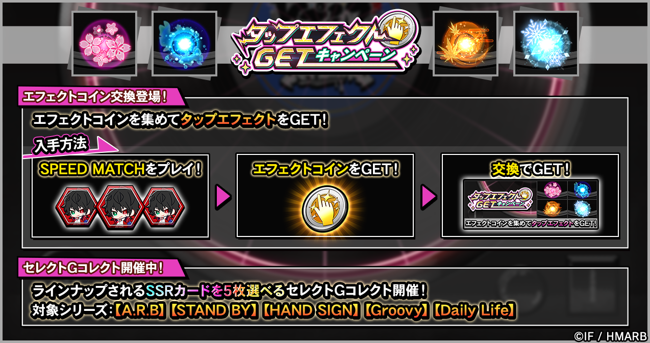 期間中、SPEED MATCHをプレイして「エフェクトコイン」を集めることで、「タップエフェクト」と交換することができるほか、ログインボーナスやA.R.B Gコレクトの[1回Gコレ]を1日1回、無料で回すことができるキャンペーンも開催しています。
