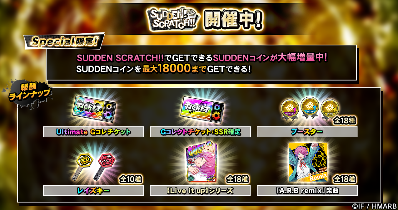 イベント期間中、KILLER SCRATCH!!をプレイするとライズ消費量に応じた確率でSUDDEN SCRATCH!!が発生します。SUDDEN SCRATCH!!をプレイすると、通常の報酬アイテムの他、限定アイテム「SUDDENコイン」を獲得することができます。「SUDDENコイン」を集めることで、「Ultimate Gコレチケット」やこれまでに登場したストーリーカード【Live it up】シリーズを最大5枚まで獲得できるほか、「A.R.B remix」楽曲などと交換することが可能です。Specialの期間中は、SUDDENコインの獲得量が通常のSUDDEN SCRATCH!!開催時より増量しており、最大18000個まで集めることができます。詳細はアプリ内お知らせをご確認ください。