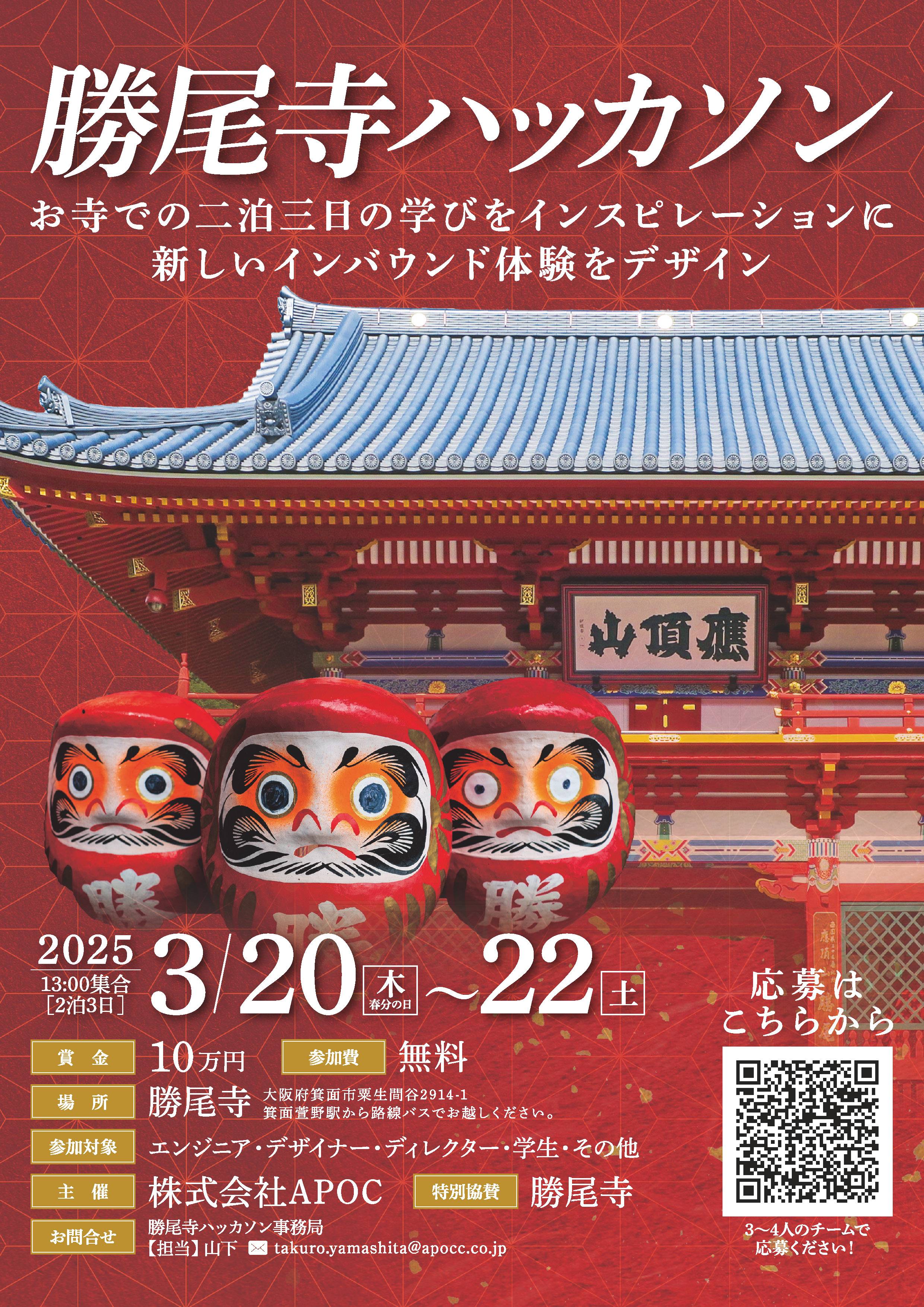 日本企業の海外進出支援およびインバウンド集客支援を行う株式会社APOC(本社:東京都板橋区、代表取締役:齋藤 峻輔)は、勝尾寺(大阪府箕面市粟生間谷2914-1)から特別協賛をいただき、参拝される外国人観光客の満足度向上を目的とした「勝尾寺ハッカソン」を2025年3月20日(木)から3月22日(土)の3日間開催することを決定いたしました。参加者には、宿・食事が無償で提供され、2泊3日の勝尾寺ハッカソンに挑んでいただきます。