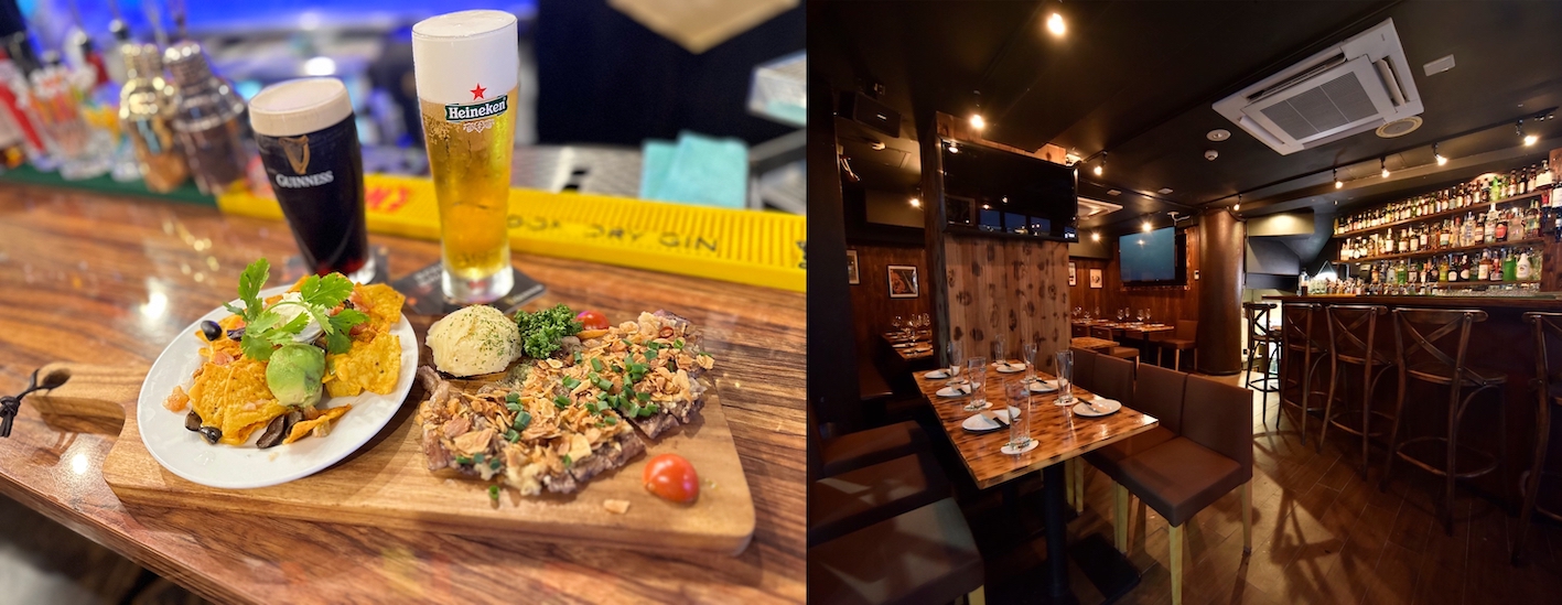 「Beerbucks grill and dining bar」ではガーリックビーフステーキとナチョス。ロックを聴きながらハイネケンやギネスビールなどを楽しめます