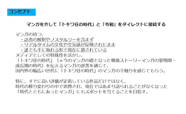 【マンガを介して「トキワ荘の時代」と「令和」をダイレクトに接続する 】をコンセプトに、マンガの持つ、話者の解釈やノスタルジーを含まずリアルタイムの文化や空気感が反映されたまま誰でも手に取れる形で現在に遺されているというメディアとしての特殊性を活かし、「トキワ荘の時代」(=今のマンガの礎となった、いわゆる「戦後ストーリーマンガ」の黎明期・成長期の時代)を伝えるマンガの選書を通じて、国内外の幅広い世代に、「トキワ荘の時代」のマンガの手触りを感じてもらうことを目指します。