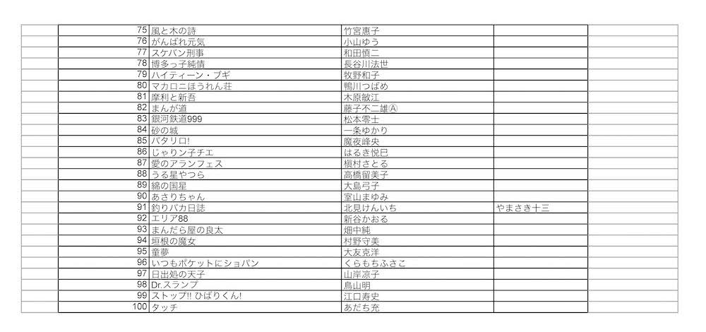 100タイトルの選出作品(以下・100作品)は、一般社団法人マンガジャパン代表の里中満智子氏を選書委員長とし、マンガジャパン会員の漫画家を中心に組織する選書委員9名による合議で選出されました。