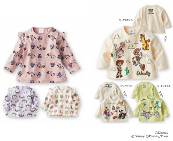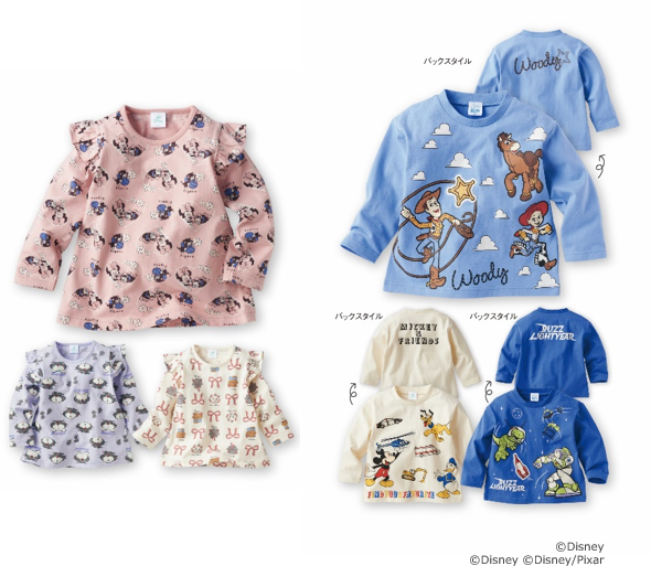 トイ・ストーリーのおもちゃたちやディズニーのネコがデザインされた長袖Tシャツ。