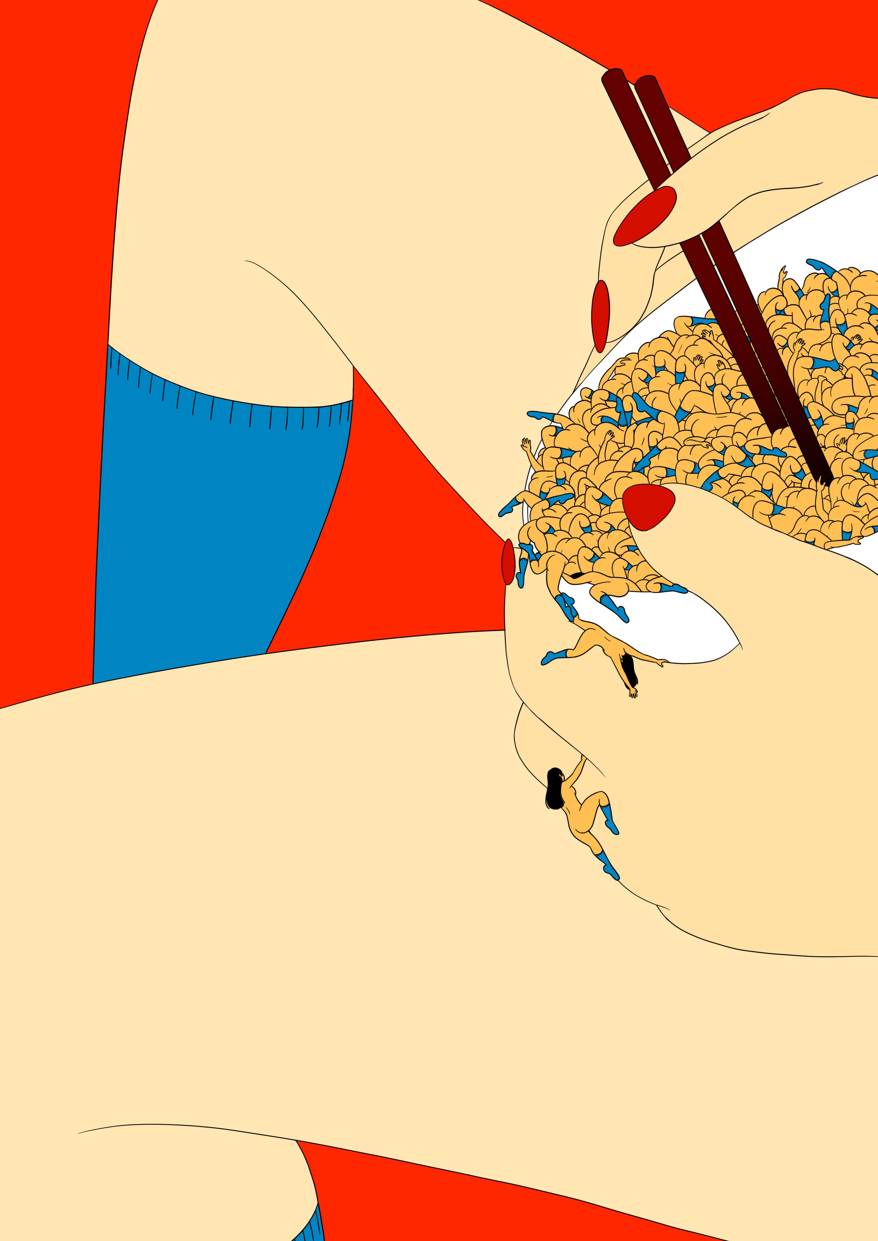 イラスト作品では点描をしたり、小さいものをたくさん描いたりというような、アニメーションでは動かすのが大変そうな繊細な表現を後先考えずやりまくれる所が好きでよくやっています。あとは基本的にお尻を描くことが多いです。造形が好きなのと、お尻周辺で行われる出来事が好きだからです。