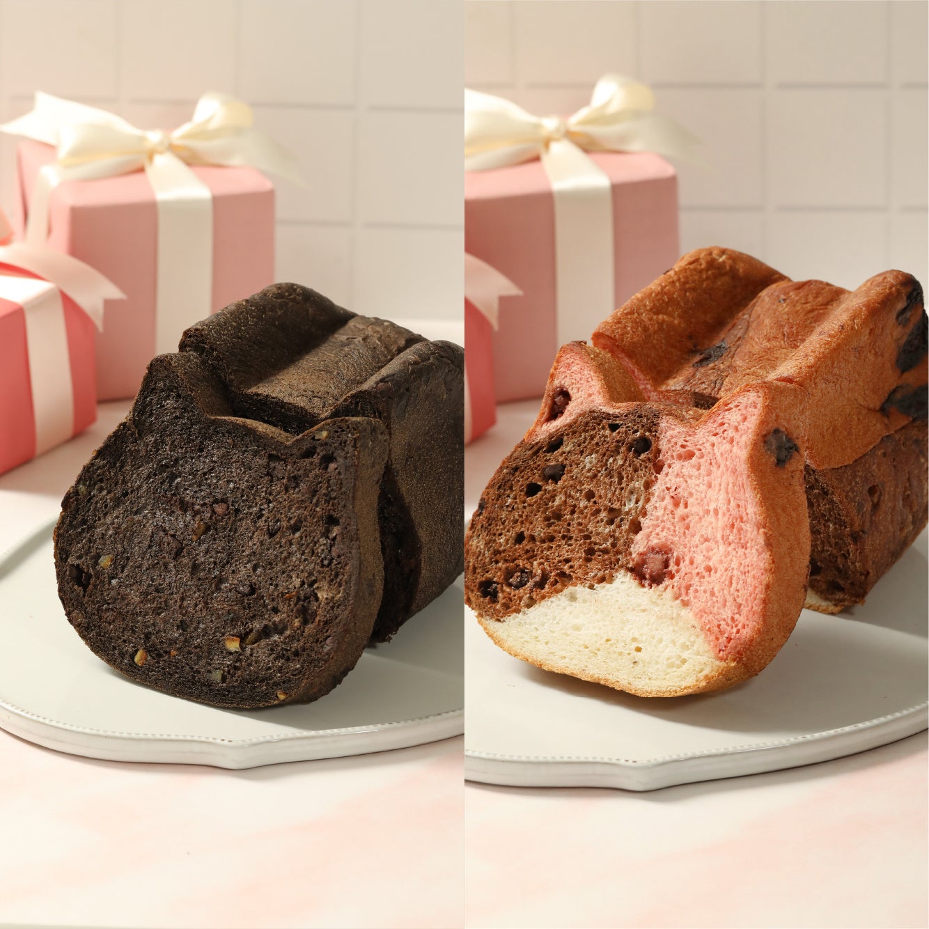 「ねこねこバレンタインセット」では、「ねこねこ食パン バレンタイン三毛猫」および「ねこねこ食パン 黒猫」の2種類のフレーバーと、思わず "きゅん" となるほど可愛いバレンタインカードをセットでお届けいたします。