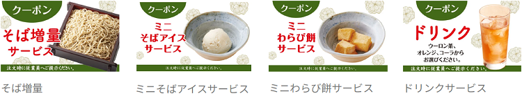 来店ごとに使える「そば増量無料」や「ミニデザート無料」などのクーポンのほか、期間限定の特別クーポンも随時更新しています。
