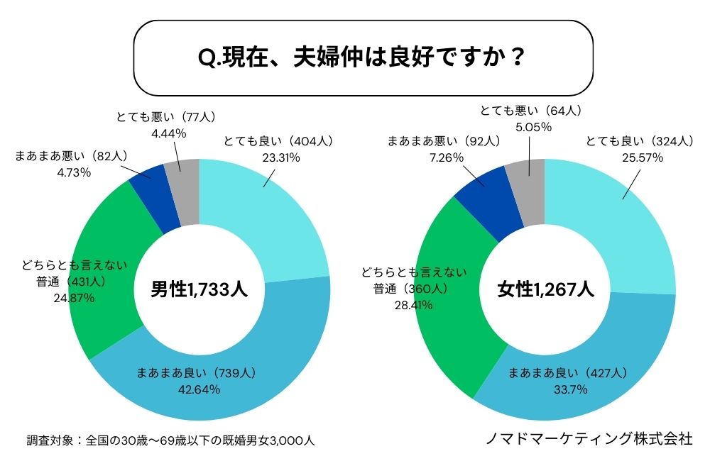 「とても良い」と回答したのは、男女それぞれ2割ほど。「まあまあ良い」を含めると、約6割の人が夫婦関係は良好と感じているようです。