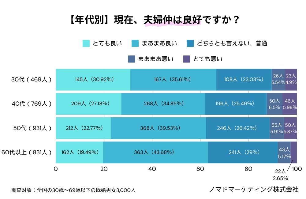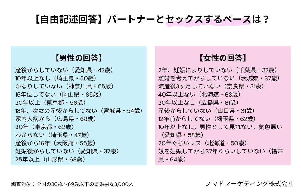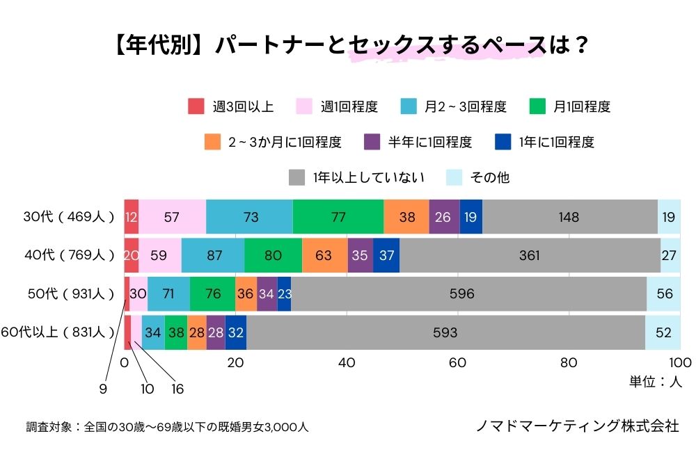 既婚者向けマッチングアプリ「既婚者クラブ」のユーザーを中心に、ノマドマーケティング株式会社(東京都渋谷区)が全国の30歳~69歳までの既婚男女3,000人を対象に、「セックスレスに関するアンケート調査」を実施しました。