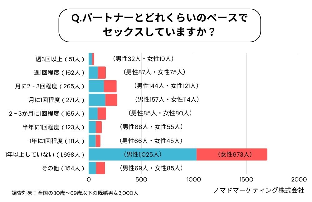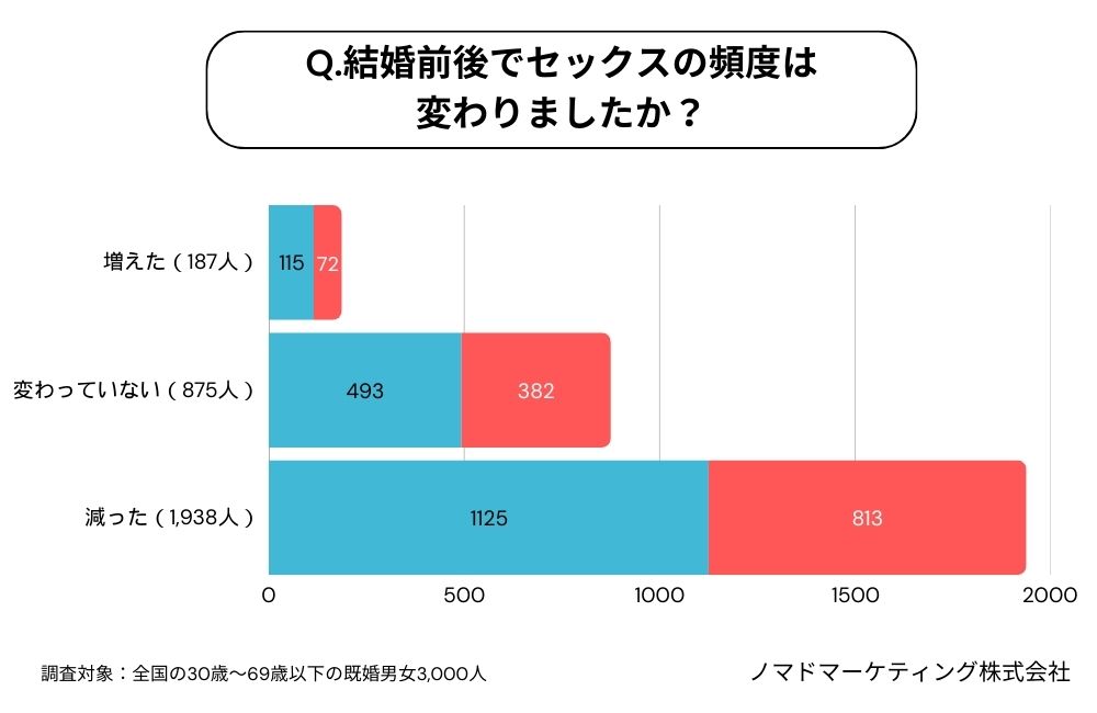 既婚男女3,000人中1,698人(56.6%)の人が「1年以上(セックスを)していない」、さらに結婚前後でセックスの頻度が「減った」と感じている人は1,938人(64.6%)でした。