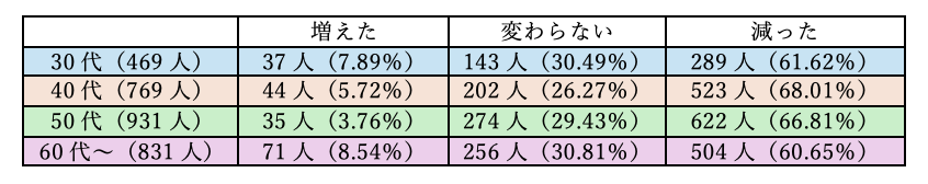 反対に「増えた」と回答した人も見られましたが、少数派です。年代別の結果は以下の通り。