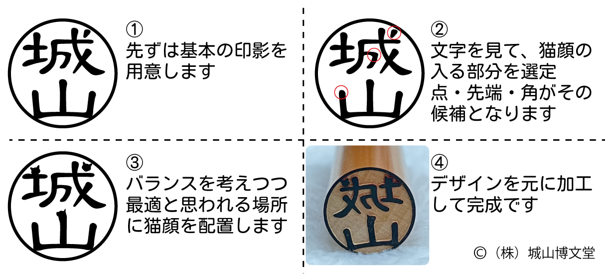 一般的な印鑑の形を元に、名前の一部(トメ・ハネ・角など)を猫の顔にデザイン。
