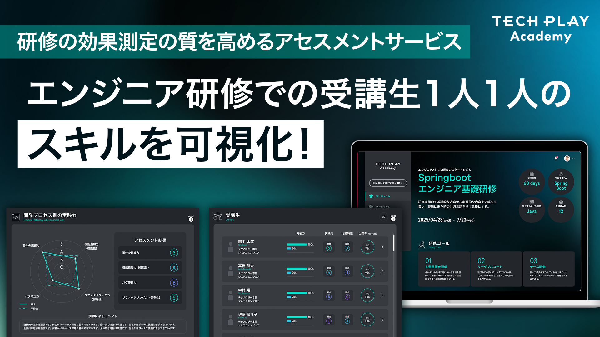 「はたらいて、笑おう。」をビジョンに掲げるパーソルグループのパーソルイノベーション株式会社 TECH PLAY Company(本社:東京都港区、TECH PLAY Company代表:片岡 秀夫)が運営する、実践型のオーダーメイド研修でDX人材を育成する『TECH PLAY Academy』(https://business.techplay.jp/)は、4月より、エンジニア育成研修における受講生一人ひとりの学習進捗やスキルを可視化するアセスメントサービスを提供開始します。企業の人事担当者や開発部署の方々に向け、研修の効果測定や開発現場での即戦力育成をサポートします。