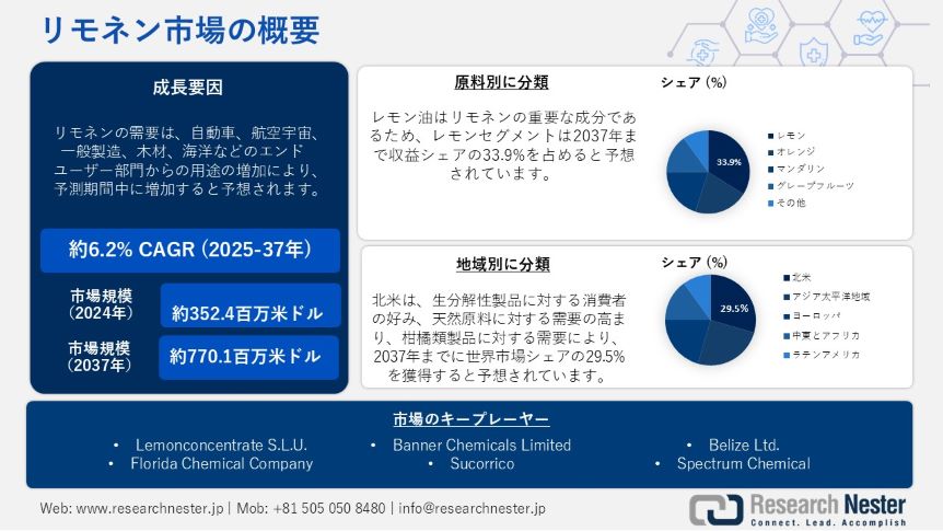 日本 – 2025年2月5日 – Research Nesterの最近の市場調査分析「リモネン市場:世界の需要分析と機会展望2037年」では、ソース、最終用途、地域別の市場セグメンテーションの観点から、詳細な競合他社の分析と世界のリモネン市場の概要が提供されています。