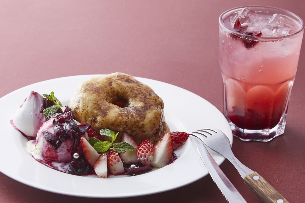 chano-ma 人気のサクサクもっちりのクロワッサンドーナツにこんがり焼いたブリュレをたっぷりのせました。自家製ローゼルコンフィチュールを旬の国産苺で甘酸っぱく仕上げた贅沢なデザートです。