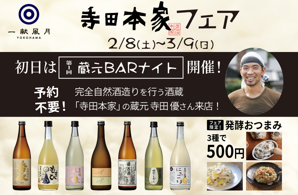 2月8日(土)~3月9日(日)の期間、一献風月 横浜店では、寺田本家フェアを開催いたします。 フェア初日には寺田本家の蔵元、寺田 優さんをお迎えして特別イベント「蔵元 BARナイト」を開催!