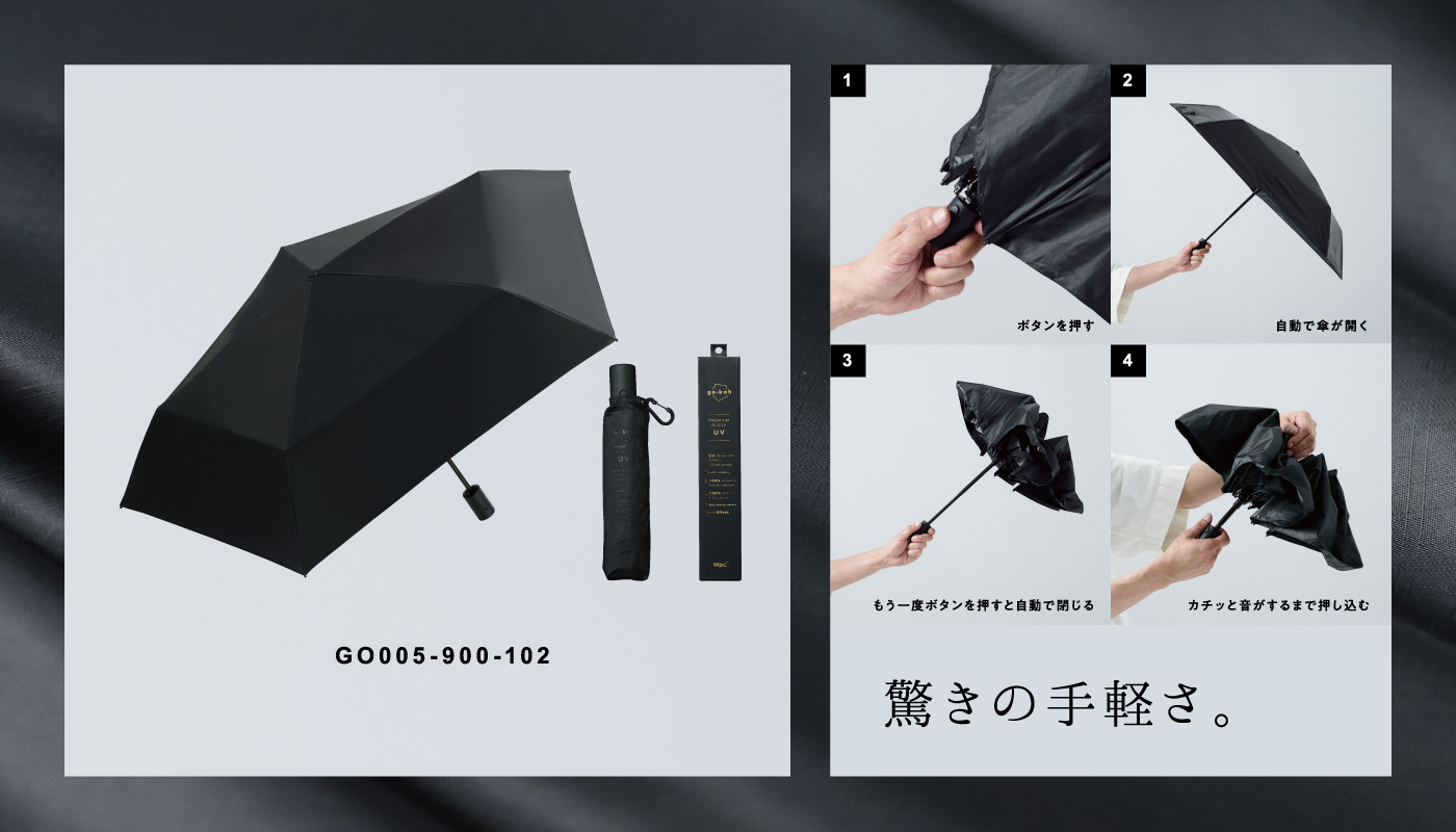 片手がふさがっていてもジャンプ傘のようにボタンを押して自動開閉できる軽量傘。中棒を縮める際、一気に押し込まないとスプリングの力で押し戻される一般的な自動開閉式折りたたみ傘とは異なり、特殊構造により少しずつ段階的に収納することができます。