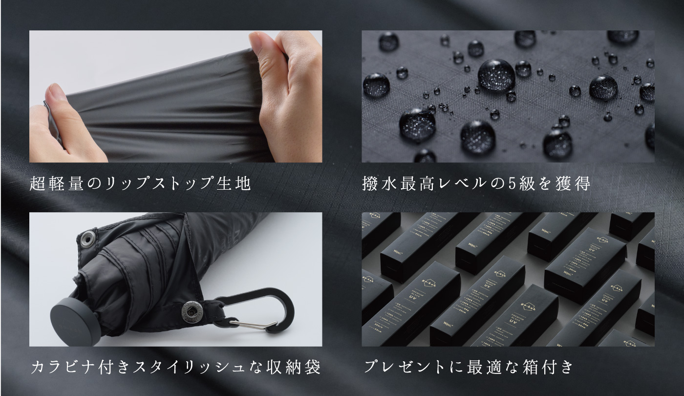 遮光UVカット率(遮蔽率)100%、遮熱効果、最高等級の撥水性に加え、軽さや小ささ、丈夫さ、簡単な操作性に特化した5種の傘をラインアップ。