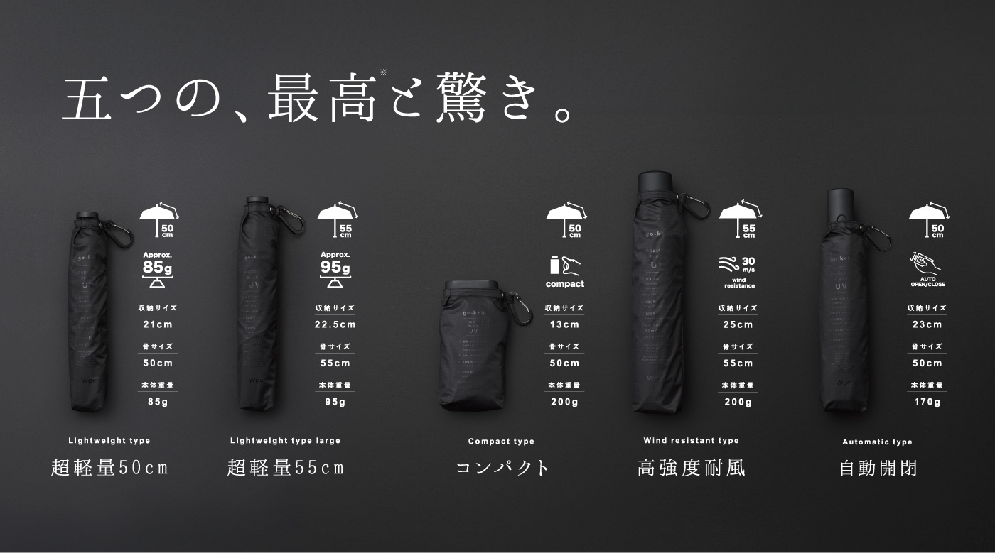 「軽い」「コンパクト」「丈夫」「自動開閉」、日傘と雨傘に望まれる機能性を驚くほどのハイレベルで持ち合わせた全5種のラインアップが完成しました。