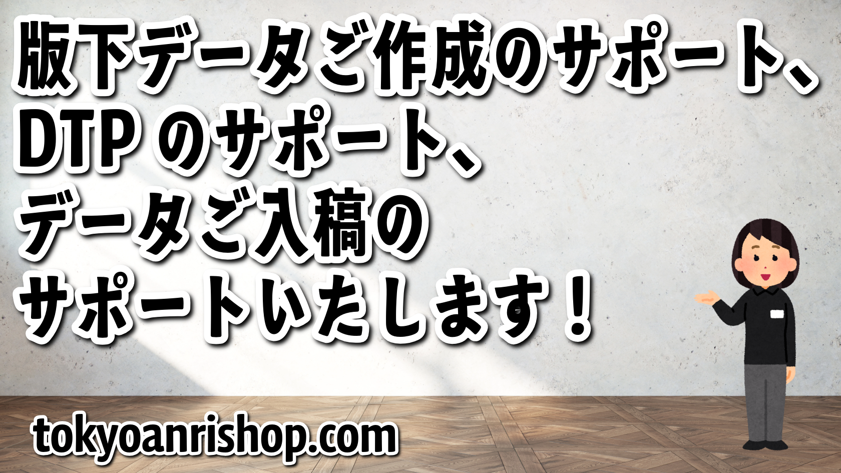 DTPサポート、印刷データご入稿サポートいたします。版下データご作成のサポート、DTPサポート、データご入稿のサポートいたします! 印刷物のデザイン制作も可能です。ご不明点お気軽にお問い合わせください。「データ作成方法」「入稿方法」「印刷」「加工」「Illustrator」「Photoshop」「.ai」「.psd」「印刷技術」「印刷方法」「サイズ」「寸法」「テンプレート」「フォントのアウトライン化」「画像解像度とは」「リッチブラックとは」「特色とは」「トリムマークとトンボは何が違うの」「アートボードサイズ」「塗り足し」「CMYK(シアン・マゼンタ・イエロー・ブラック」「リンクがよいのか埋め込みがよいのか」ご不明点、お気軽にお問い合わせください。