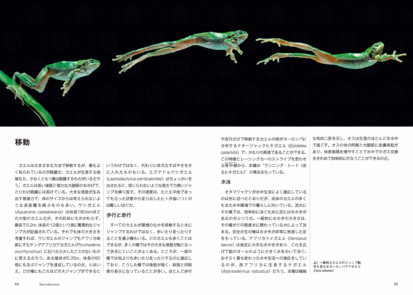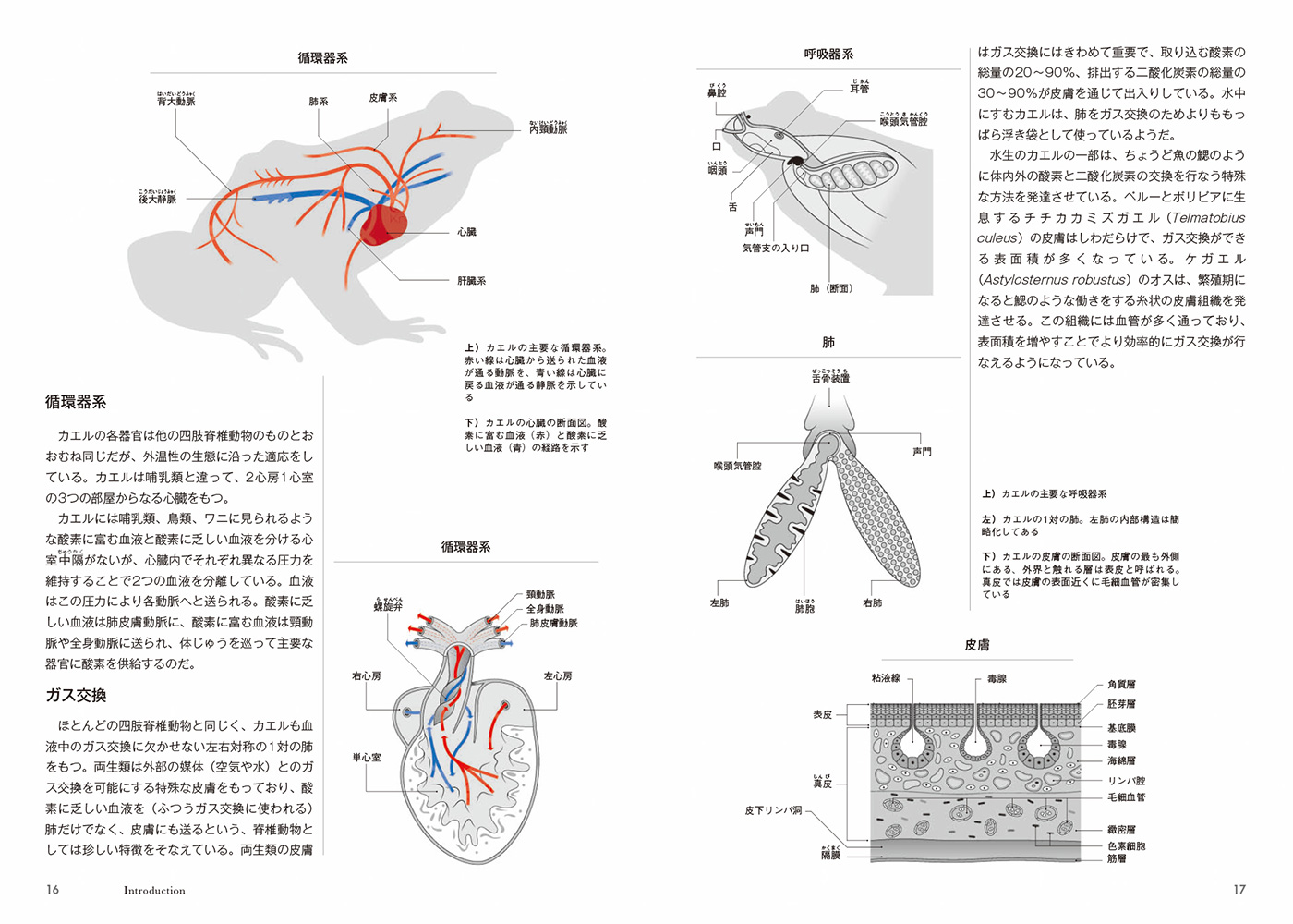 本書はそんなカエルたちの起源と進化からライフサイクル、防御戦略に至るまで、あらゆる情報を詳しく網羅した解説書です。カエル全科の種の生態を美しい写真とともに紹介し、多彩な外見、生息環境、習性を解き明かしていきます。分類、体の構造、移動方法、繁殖、食性などについても網羅し、爬虫両生類学者、博物学者、そして両生類に興味をもつすべての人に役立つ1冊です。