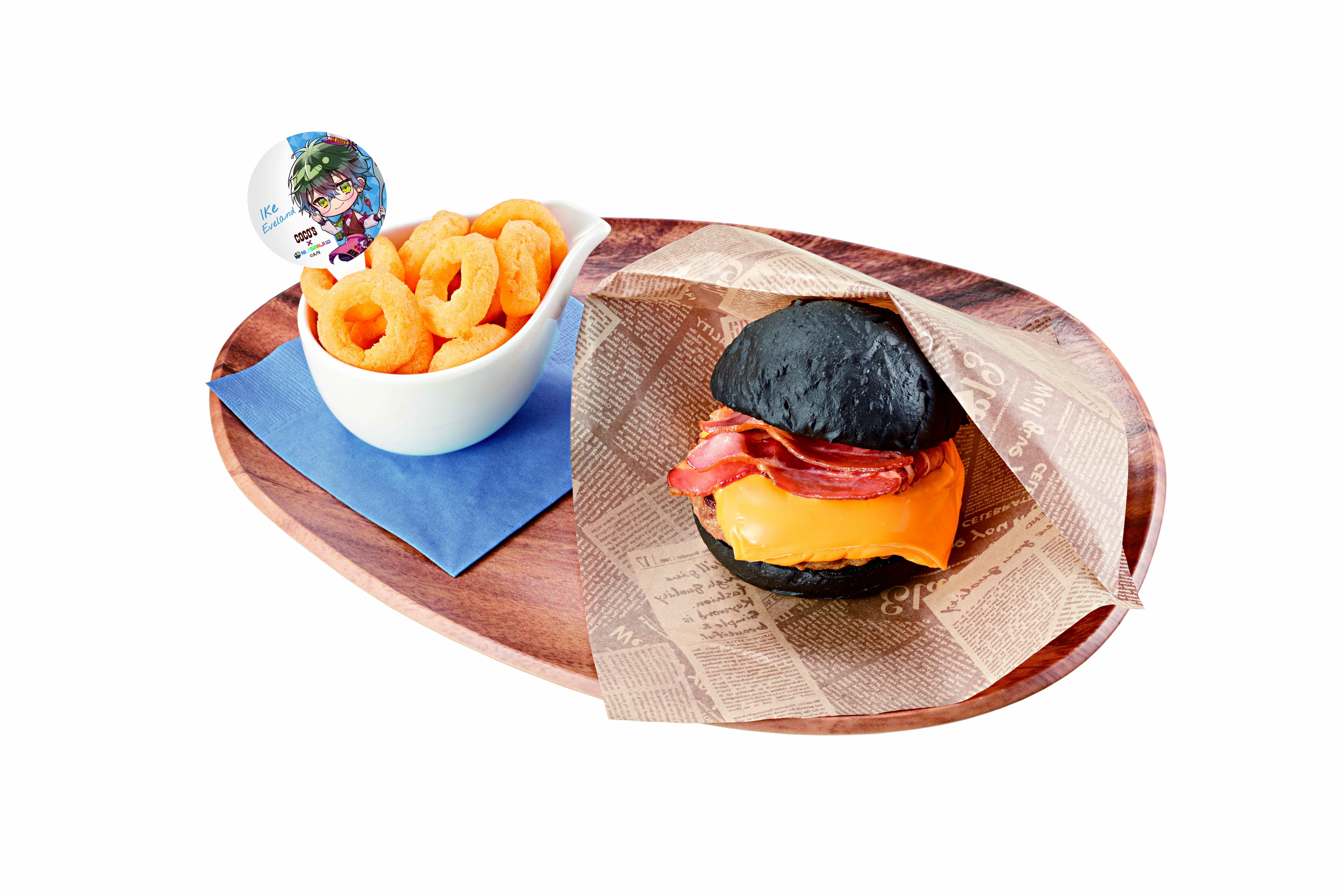 アイクの好物であるハンバーガーにキャラカラーを入れて、ココス風にアレンジしました。ココスのジューシーなハンバーグと香り高いベーコン、濃厚なチェダーチーズをブラックバンズで挟んだハンバーガーは食べ応え抜群です。付け合わせの、アイクが好きなチーズ風味のスナック菓子と一緒にお楽しみください。