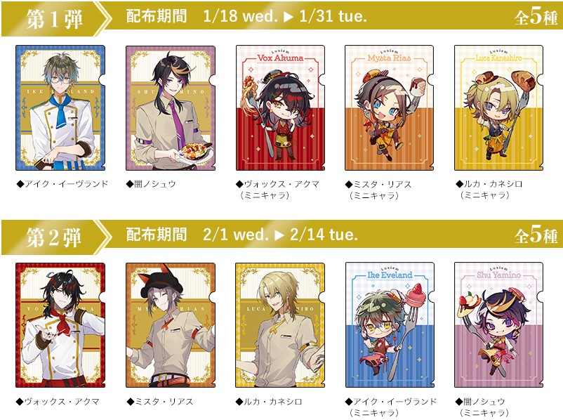 今回のキャンペーンでは、『にじさんじ』に所属する、ユニット “Luxiem(ルクシム)”と“ROF(ろふ)-MAO(まお)”の各ライバーをイメージしたコラボメニューを販売します。コラボメニューを含む対象メニュー1品のご注文につき、ココスオリジナルクリアファイル(A4)を1枚プレゼントします。