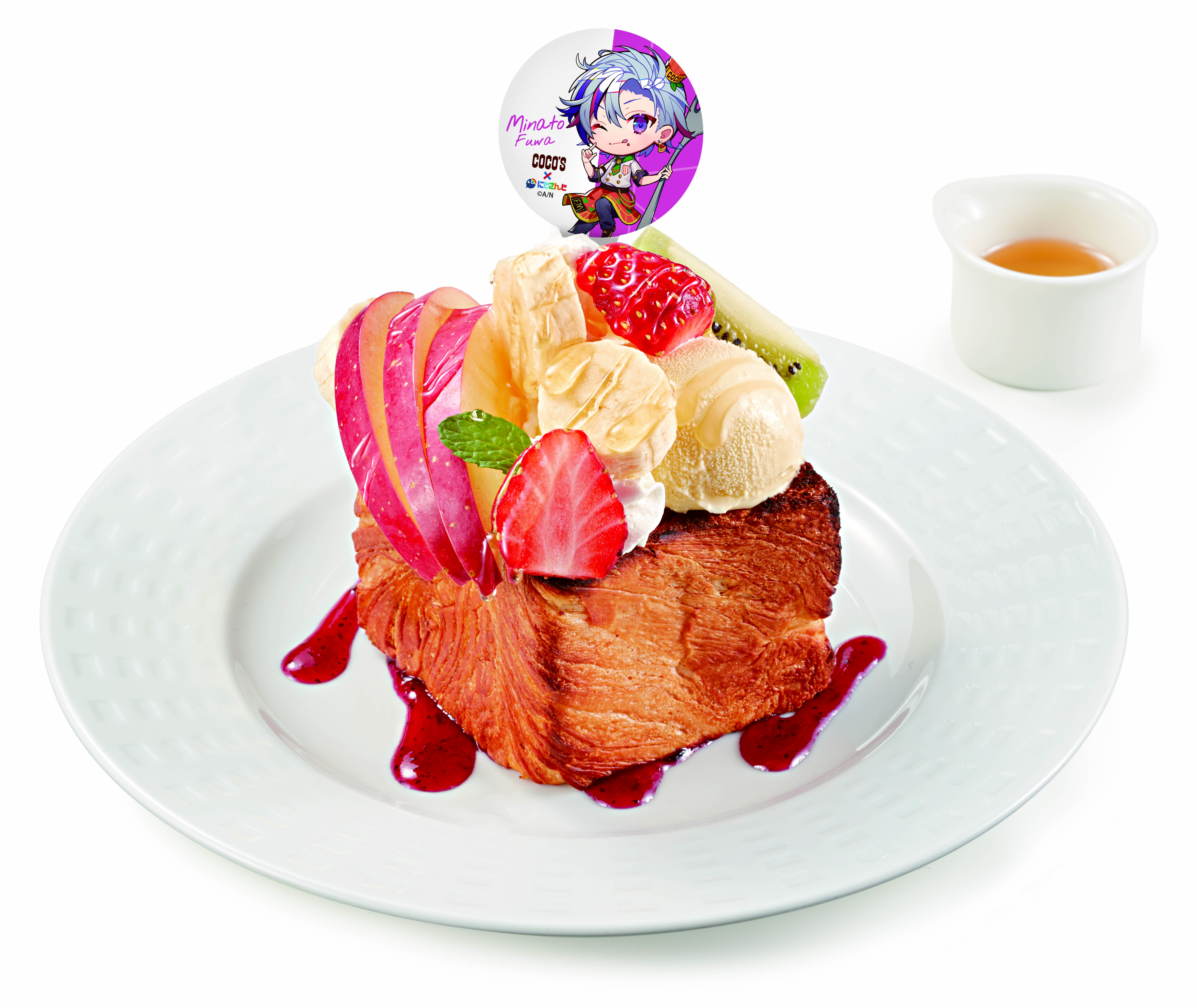 不破(ふわ)湊(みなと)の好物ハニートーストを、バーチャルホストにふさわしい華やかな見た目に仕上げました。サクサクふわふわなデニッシュ生地の上に、いちごやリンゴ、キウイ、バナナなどのフルーツを華やかに飾り付け、はちみつをかけた商品です。一口食べればバターの香りが広がるデニッシュと甘酸っぱい爽やかなフルーツ、バニラアイスの組み合わせは相性抜群。お好みで別添えのはちみつをさらにかけてお召し上がりください。
