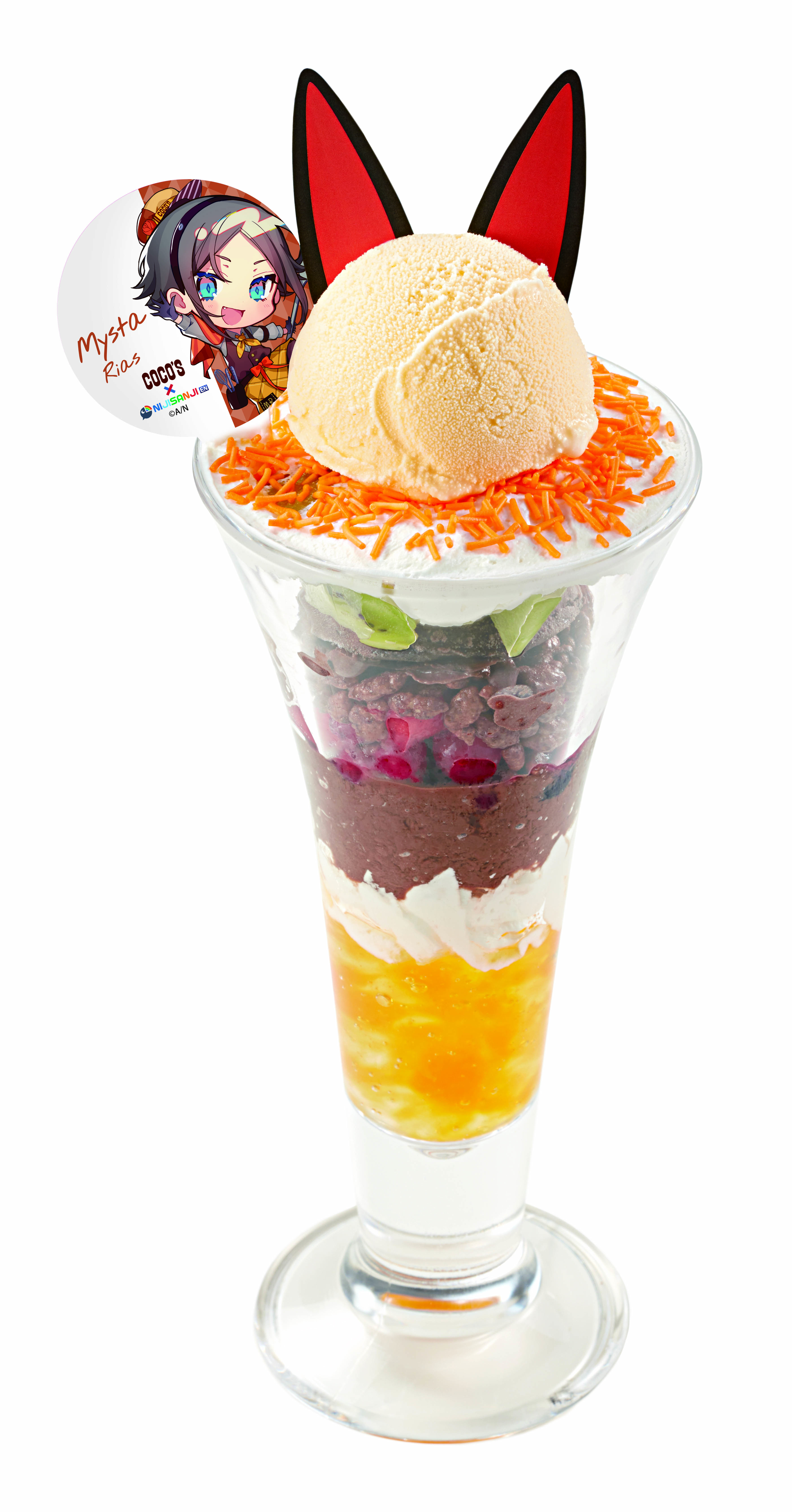 トップにミスタを型どった、キャラカラーのオレンジ色が目を惹くかわいらしいパフェです。パフェの中層はミスタが好きなチョコアイスやチョコプリンに、キャラカラーをイメージした爽やかな味わいのオレンジソースを合わせており、コクがありながらもさっぱりとした味わいをお楽しみいただけます。ミスタが好きなフレッシュキウイも入れました。パリパリ食感のシュガースプレーやサクサクのチョコクリスピーで食感もお楽しみください。