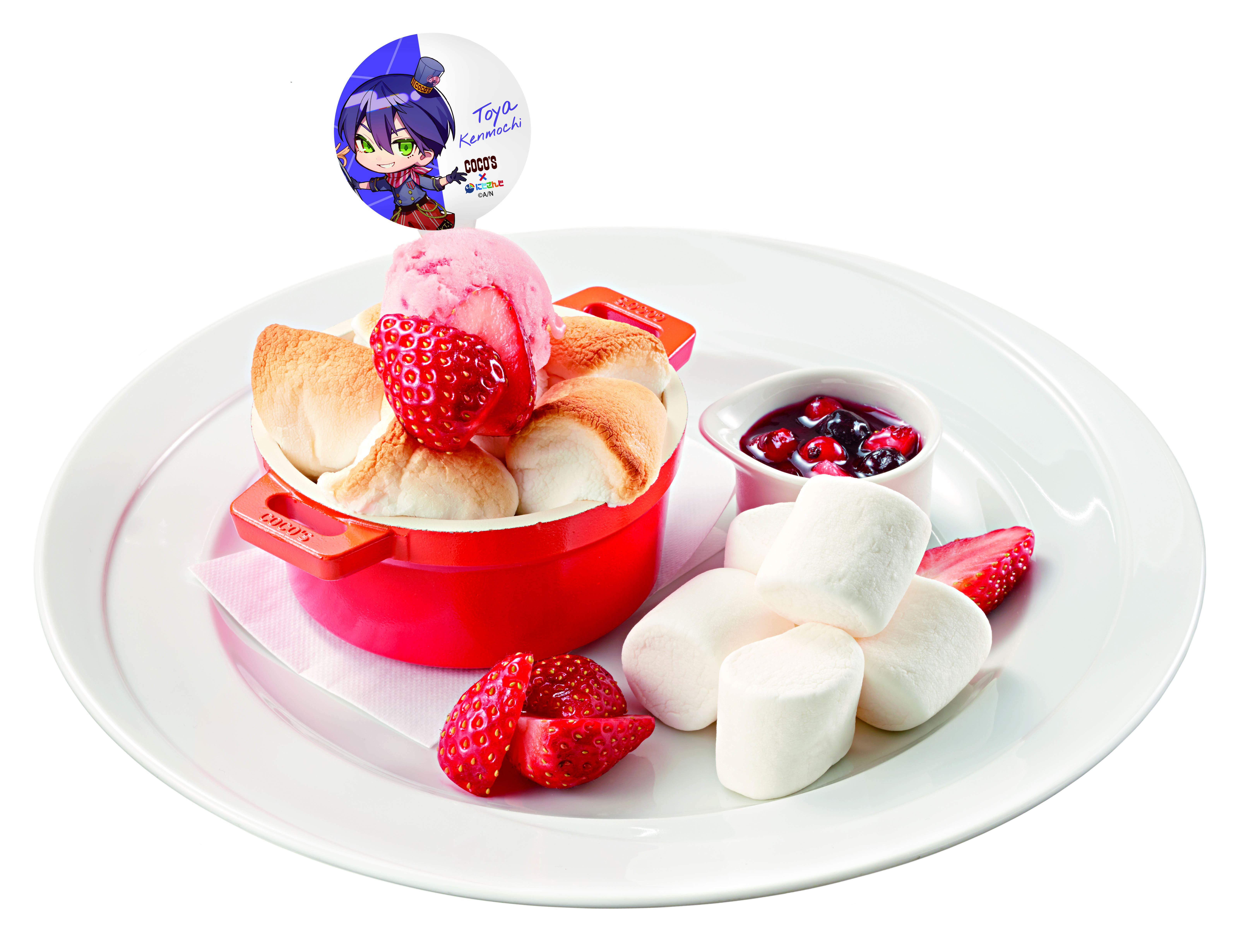 ココットにガトーショコラとバナナを入れ、大きなマシュマロで覆って焼き上げたコラボ限定スモアが登場します。オーブンで焼き上げた大きなマシュマロはふわふわ食感がたまりません。甘酸っぱいストロベリーシャーベットや別添えのいちご、剣持(けんもち)刀也(とうや)のキャラカラーをイメージしたブルーベリーソースを合わせることで、甘いスモアをさっぱりとした味わいでお楽しみいただけます。