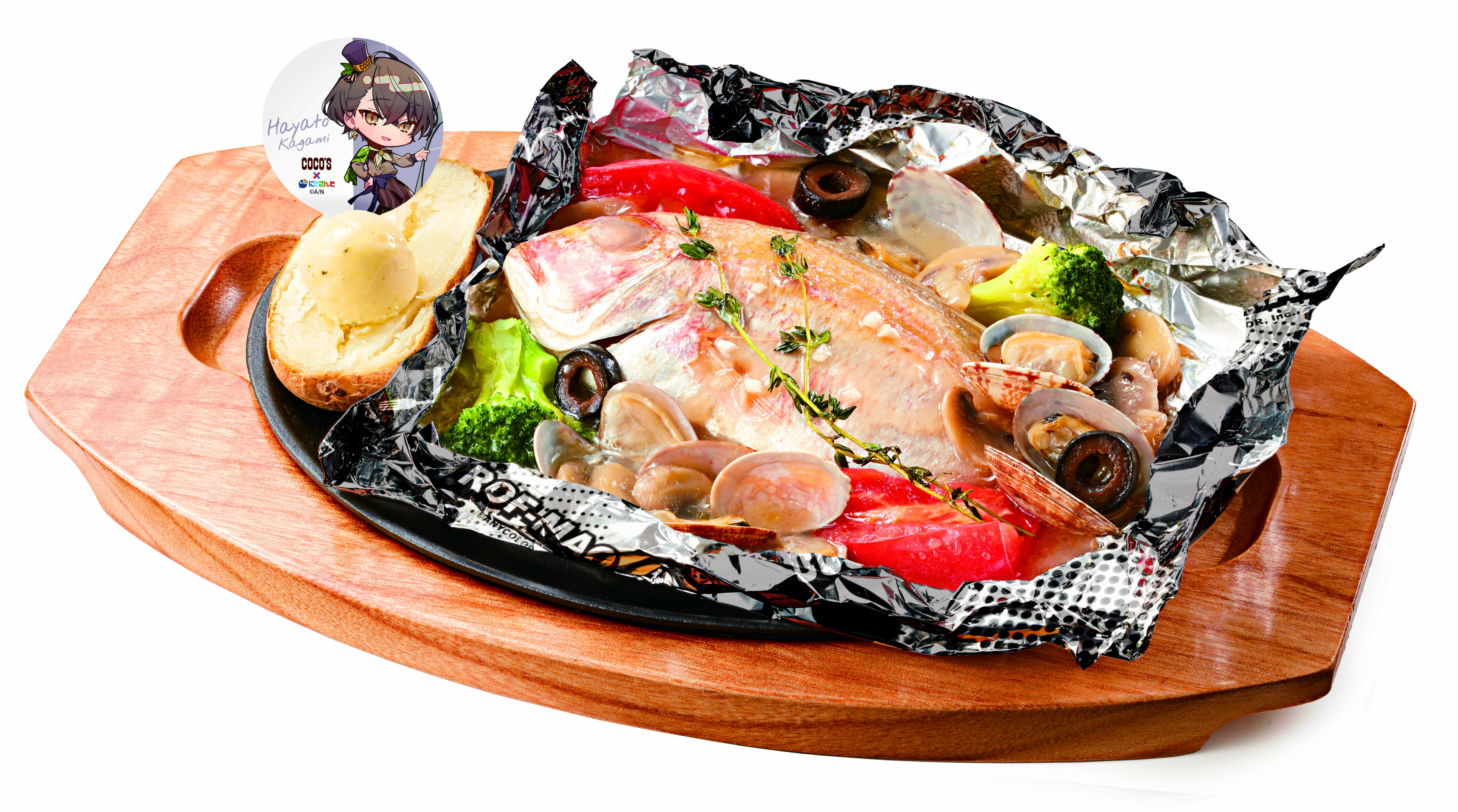加賀美(かがみ)ハヤトが甲斐田(かいだ)晴(はる)のトマト嫌いを克服するために作ったアクアパッツァをココス風にアレンジしました。まるまる1尾の鯛やあさりなどの魚介、トマトやマッシュルーム、オリーブ、ブロッコリーなどの野菜を包み焼きにし、旨みを閉じ込めました。開けた瞬間タイムの爽やかな香りが広がり食欲をそそります。コラボ限定の【ROF(ろふ)-MAO(まお)】オリジナルホイルで包んで提供します。