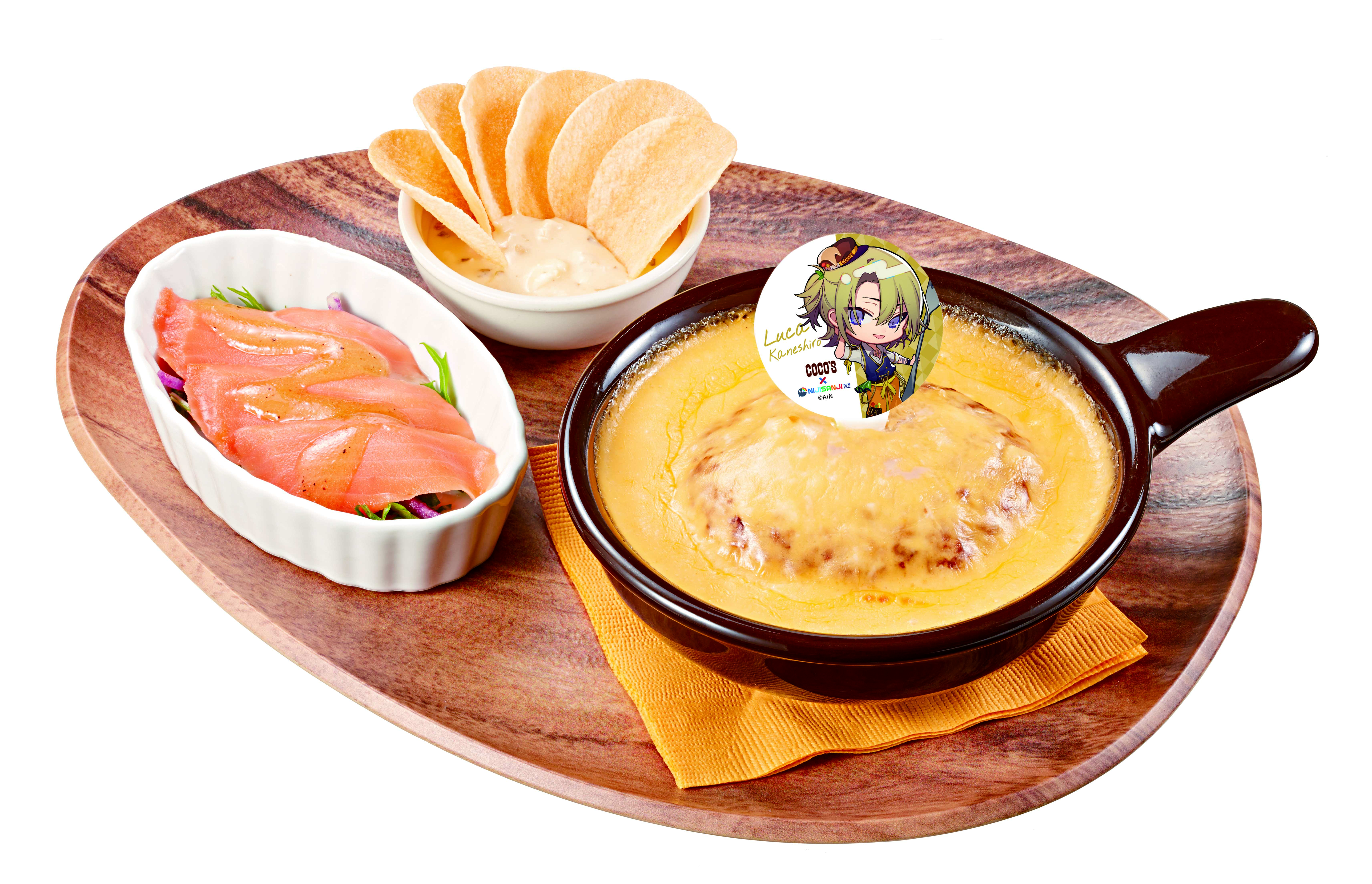 ルカの口癖「POG(ポグ)!(すごいなどの意味合い)」にかけて、ポーク(POG!)ハンバーグを使用し、チーズソースがゴールデンに輝くハンバーグドリアに仕上げました。付け合わせにはルカの好きなチーズ味のスナックやサーモンのカルパッチョを用意しました。ルカが嫌いな野菜は少なめに仕上げています。チーズ味のスナックは酸味のあるタルタルソ―スと相性抜群です。