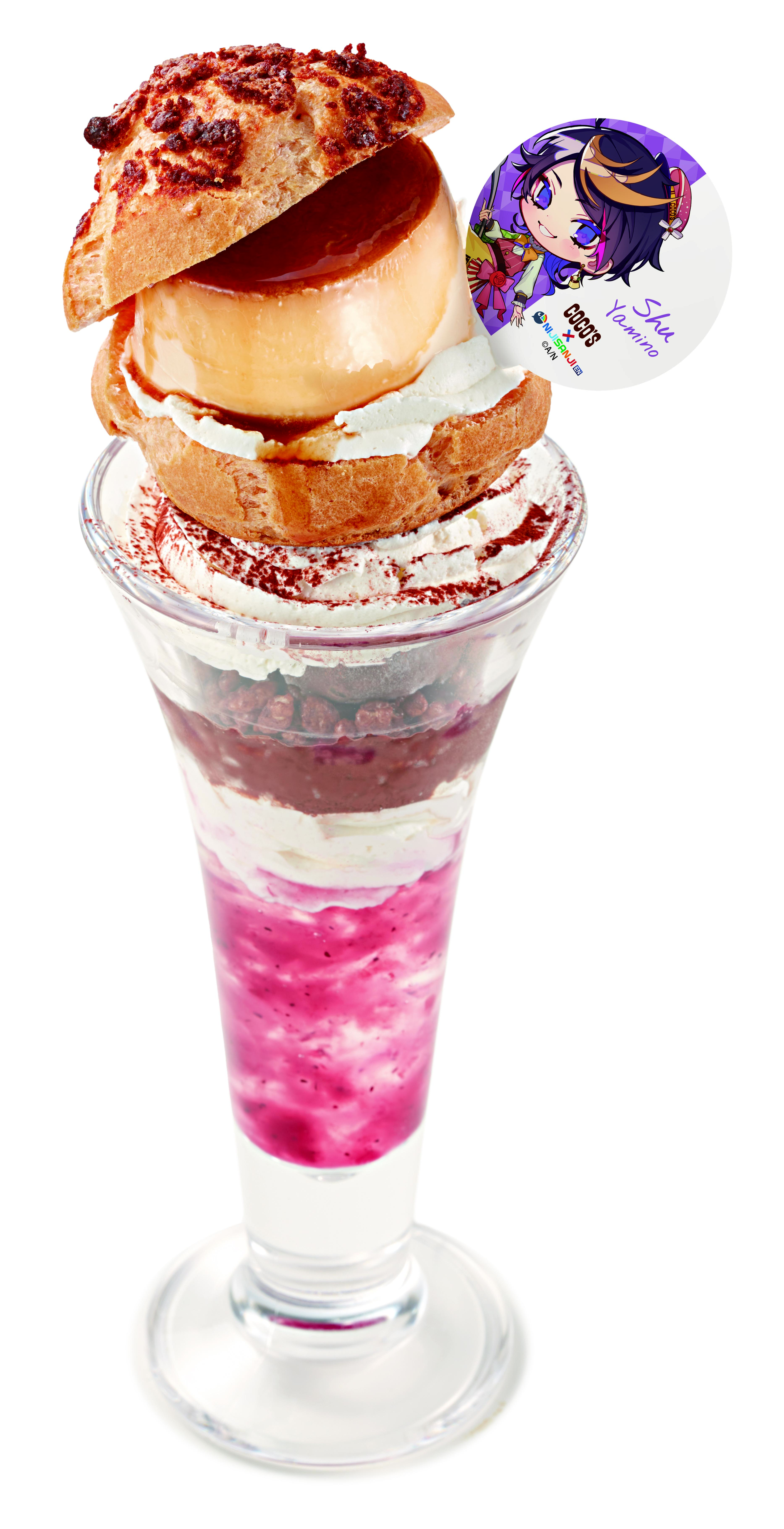 シュー生地に華やかな香りが特長のCoCoプリンを挟みトップにのせた、インパクトのあるパフェです。ブルーべリーソースは闇ノシュウのキャラカラーを、チョコプリンやチョコアイスは闇ノシュウをイメージしたカラーになっています。遊び心あるコラボメニュー名もポイントで、甘党でダジャレ好きな闇ノシュウにぴったりのデザートです。