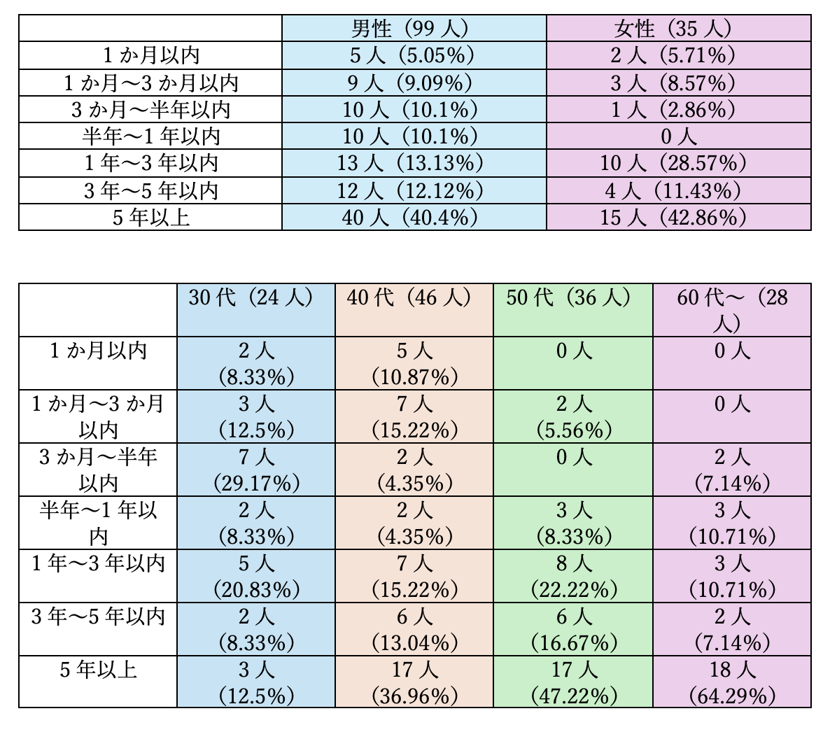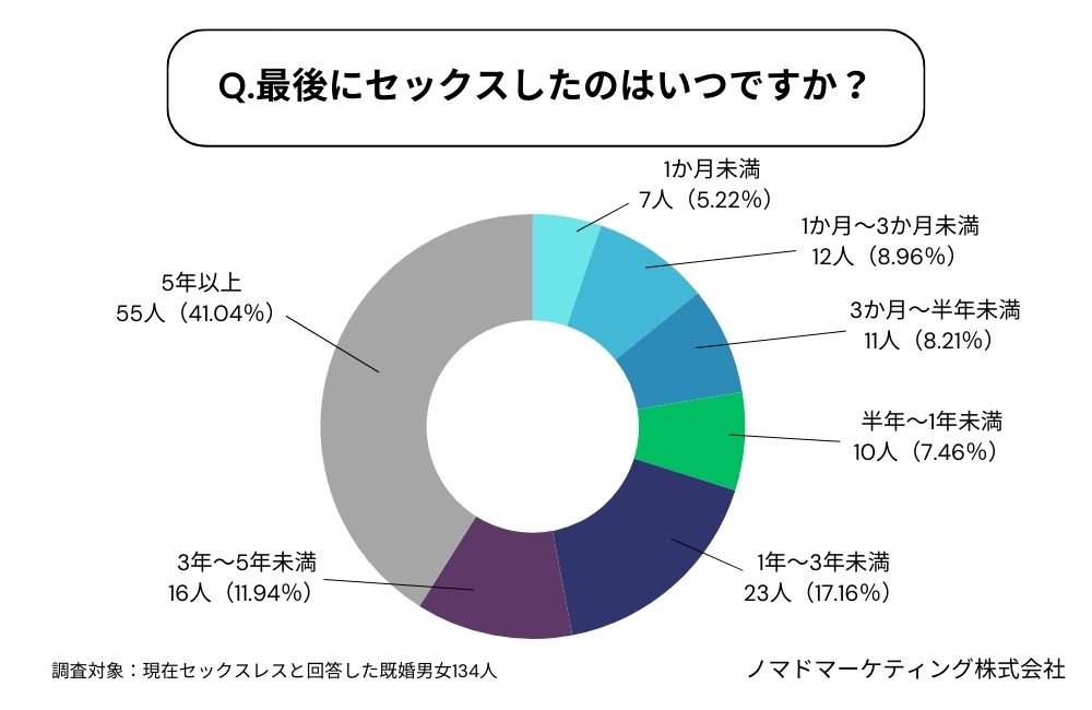 続いて、現在セックスレスだと回答した既婚男女134人(男性99人・女性35人)に対し、パートナーと最後にセックスしたのはいつだったのかを聞きました。